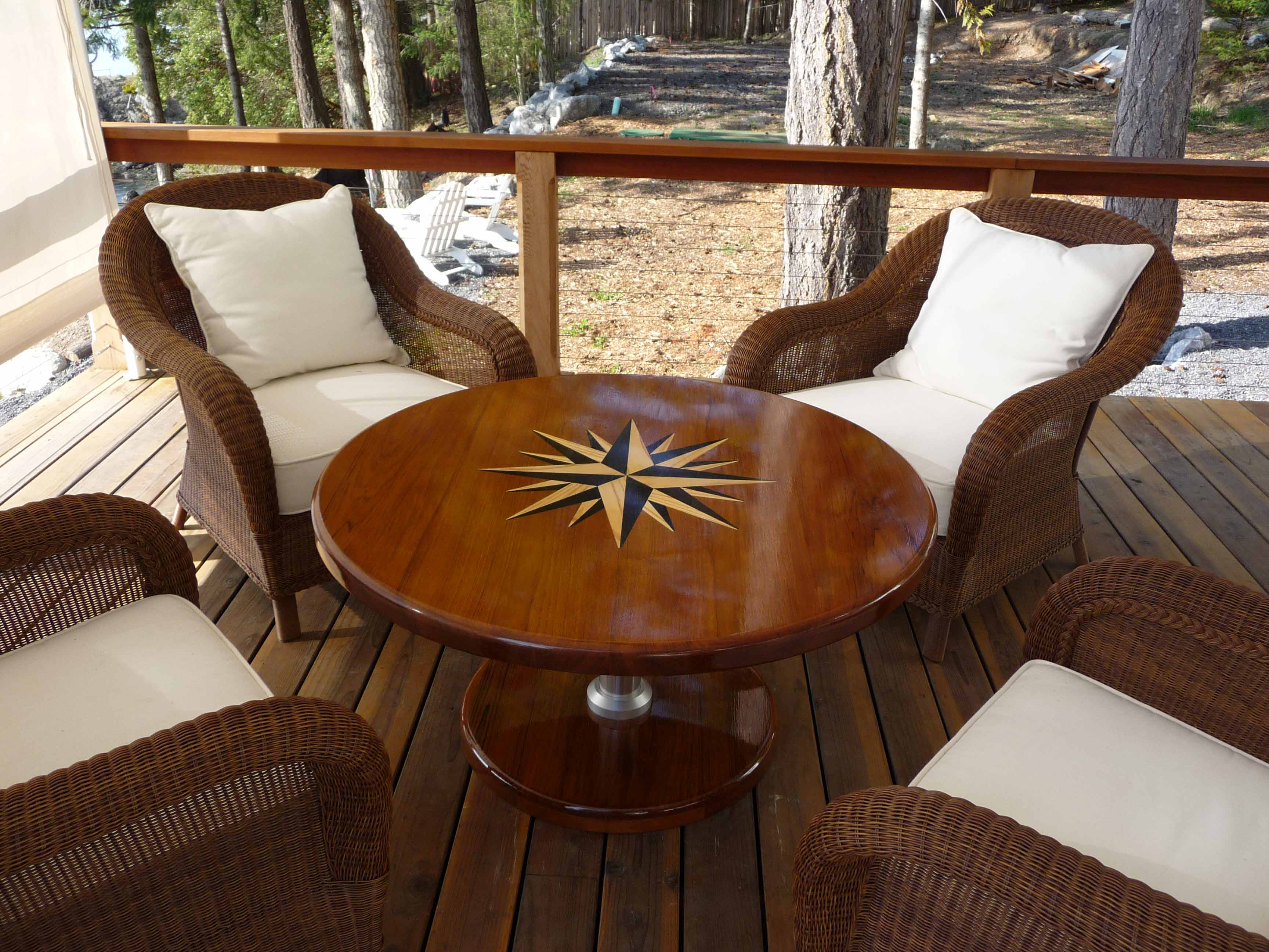 Our custom teak cockpit tables are constructed from solid planks of teak–no veneers!  We can oil or varnish the tables at your request, or leave them with an unfinished texture for a more classical look.  The teak designs can also feature our custom, multi-colored inlaid designs, all according to your request.  Teak is our preferred product material and we are proud to take on any design challenge for your teak cockpit table.