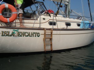 Our Cruising Concepts ladder, custom made for us by Mike, has been one of the best additions we have made to our Island Packet 350. Last year we changed from an inflatable dinghy to a fiberglass Bauer 10 but could not get in and out of the dinghy through the sugar scoop transom of the IP without banging the dinghy into the mother ship. The ladder has allowed us to climb in and out of the dinghy securely and having both boats protected with regular fenders hung on both sides of the ladder. Problem solved!