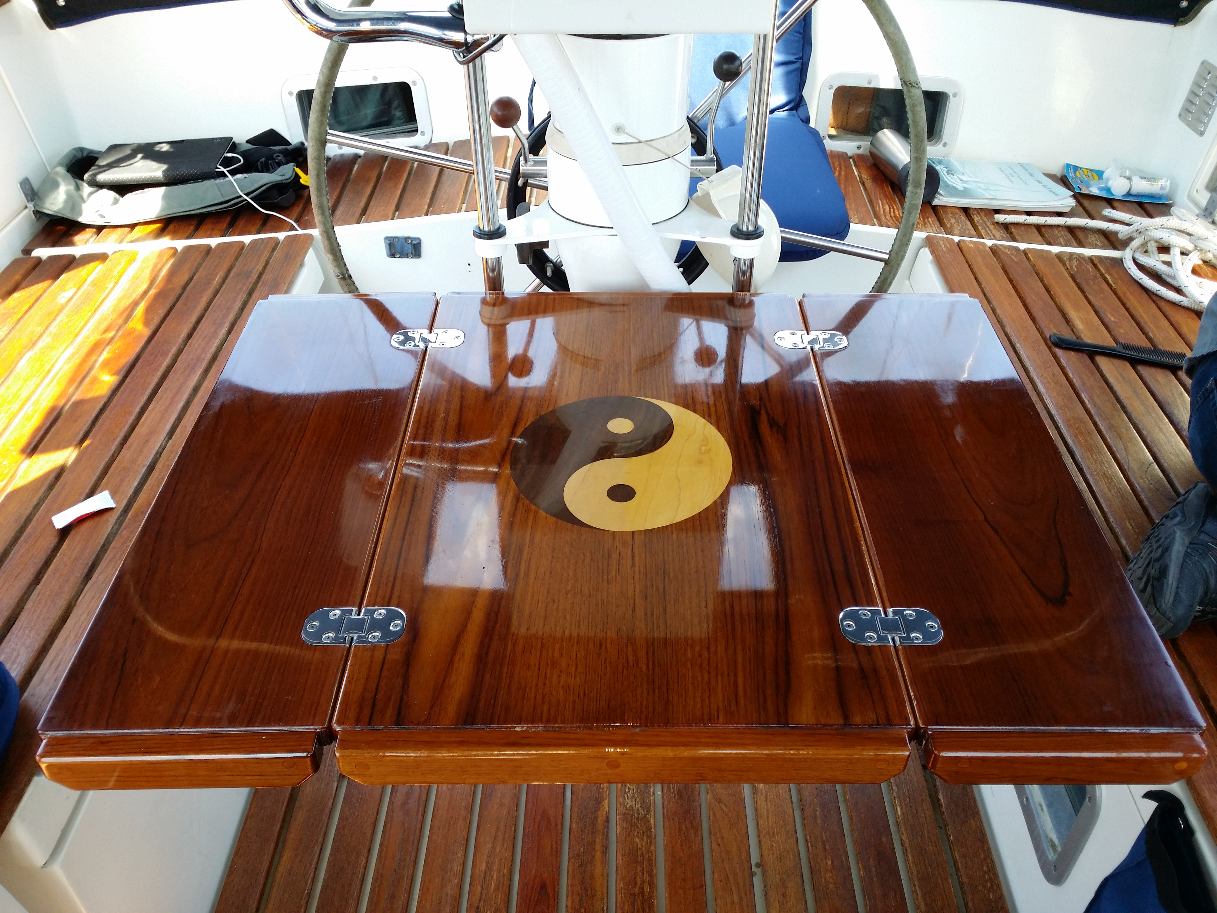 We use folding brackets to safely support our folding leaf cockpit table designs.  The hinges are designed and installed to avoid interruption of the table surface area and ensure smooth folding in any circumstance.  Cruising Concepts has experience in providing any type of folding design above or below the table base.  We also enjoy adding custom inlays into the table leaves for strong thematic appeal.